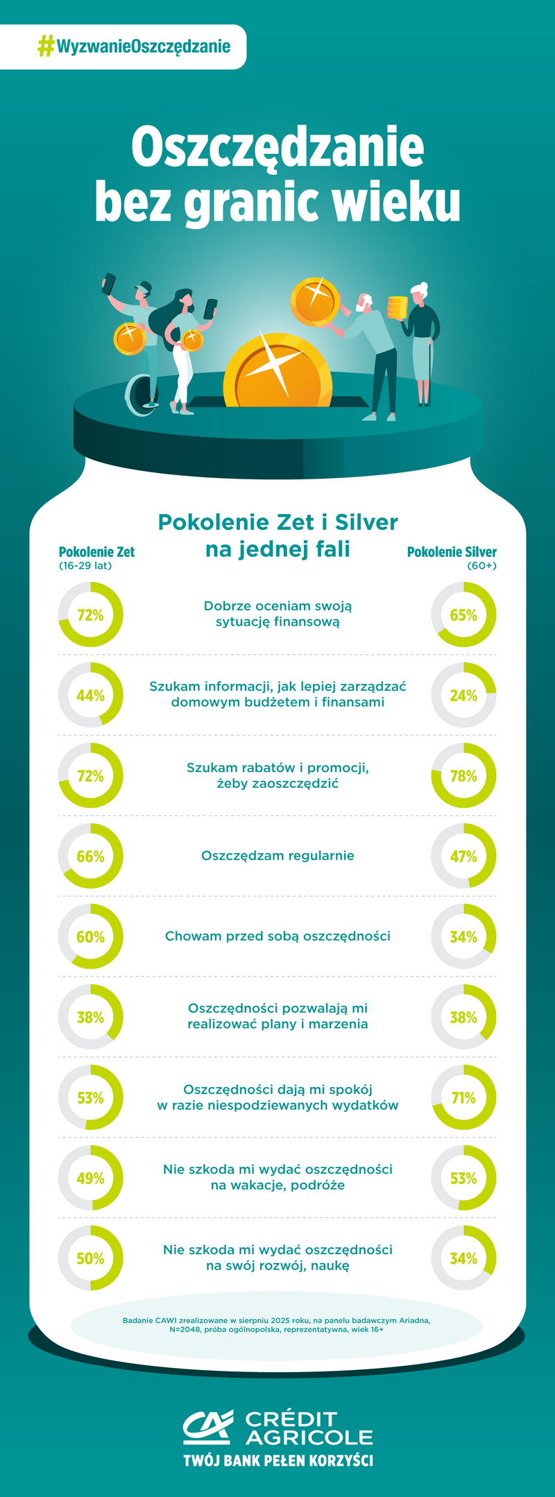 Credit Agricole od lat bada postawy Polaków do oszczędzania i zarządzania domowym budżetem. W tegorocznej edycji badania wziął pod lupę także doświadczenia i przeżycia. Okazuje się, że z oszczędności finansuje je 36 proc. przedstawicielek i przedstawicieli pokolenia Zetek (19-26 lat) i 38 proc pokolenia Silver (60+ lat). To o sześć punktów procentowych więcej niż średnia dla wszystkich badanych osób.